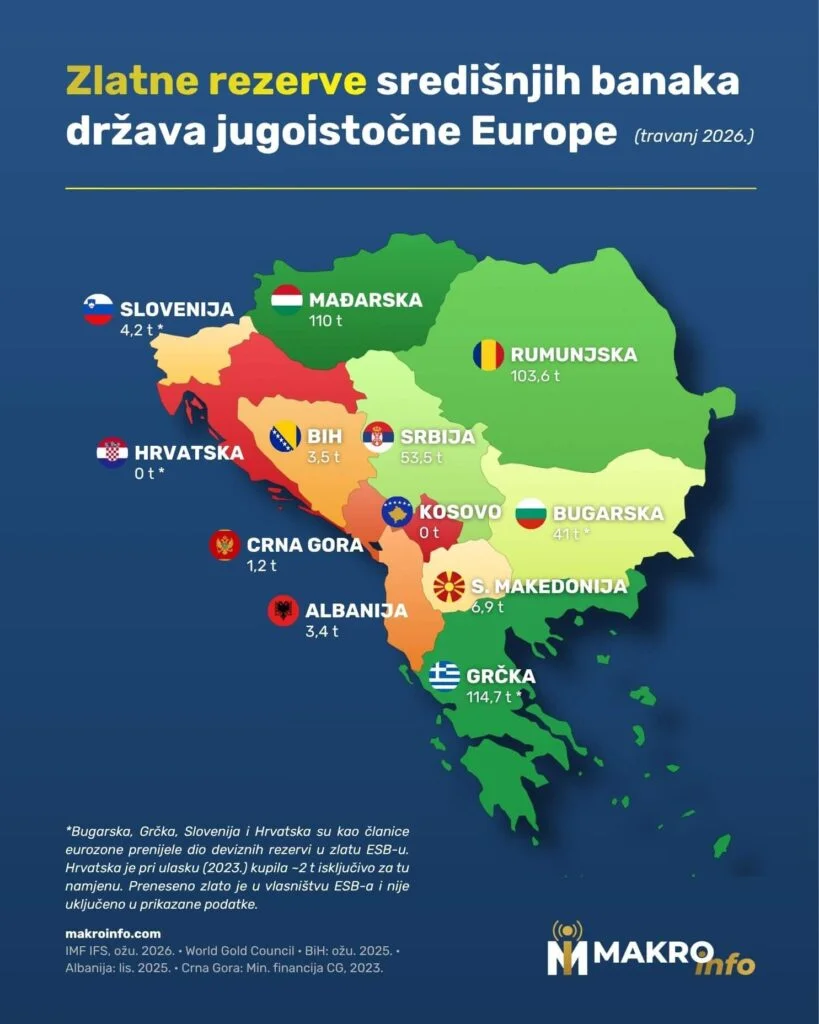 Dok središnje banke diljem svijeta već treću godinu zaredom gomilaju rekordne količine zlata, razlike među državama jugoistočne Europe nikada nisu bile izraženije. Na jednoj strani su zemlje koje čuvaju više od stotinu tona, a na drugoj one koje su – poput Hrvatske – ostale bez ijednog grama.